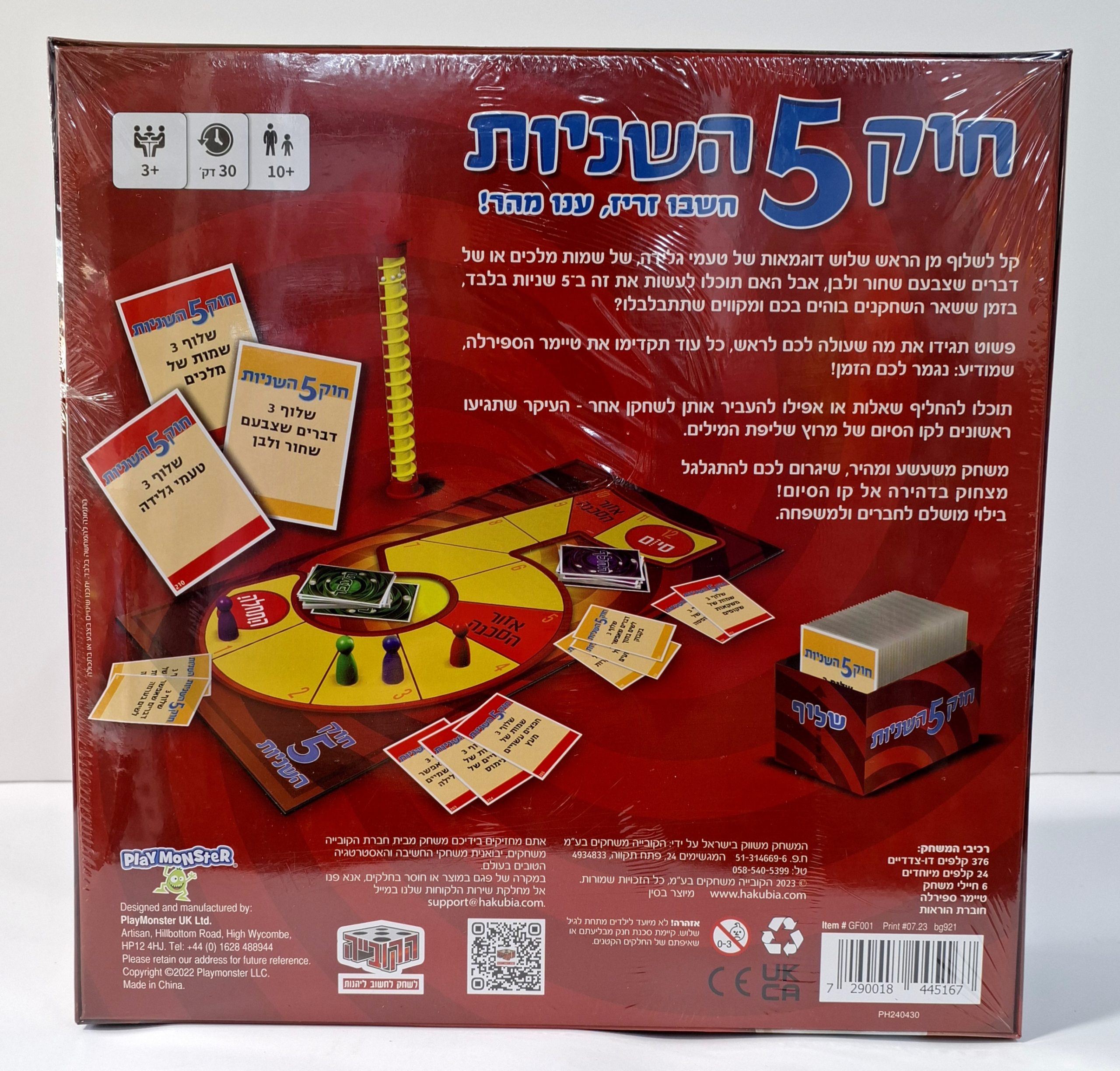 חוק 5 השניות הוא משחק קופסה מהיר, משעשע ומאתגר, שמעמיד אתכם בלחץ הזמן! המשחק מבוסס על הקונספט הפשוט אך המורכב: האם תוכלו לחשוב מהר ולתת שלוש תשובות נכונות בתוך חמש שניות בלבד?